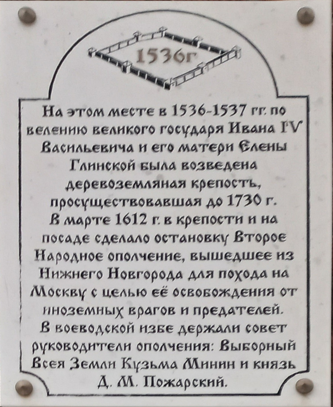 «На этом месте в 1536–1537 гг. по велению государя Ивана IV Васильевича и его матери Елены Глинской была возведена деревоземляная крепость, просуществовавшая до 1730 г. В марте 1612 г. в крепости и на посаде сделало остановку Второе Народное ополчение, вышедшее из Нижнего Новгорода для похода на Москву с целью ее освобождения от иноземных врагов и предателей. В воеводской избе держали совет руководители ополчения: Выборный Всея Земли Кузьма Минин и князь Д.М. Пожарский»